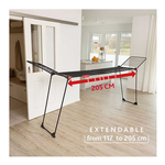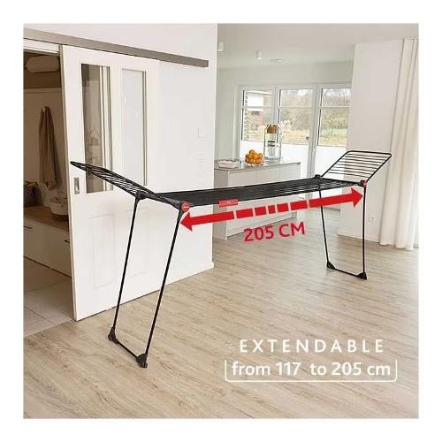 Con Vileda Infinity Flex Ultimate e il suo design, asciugare il bucato è più elegante e confortevole che mai. L'accattivante colore nero valorizzerà la tua casa, donando un tocco di moderna eleganza e raffinatezza. Lo stendibiancheria flessibile può essere esteso e raggiunge uno spazio di asciugatura massima di 30 metri per un uso comodo e pratico. Devi asciugare tovaglie, lenzuola o capi di grandi dimensioni? Grazie alla griglia centrale telescopica (estensibile da 117 a 205 cm), puoi appendere facilmente i capi più grandi senza piegarli. E poiché la griglia è alta anche 1 metro da terra, non toccheranno il pavimento.