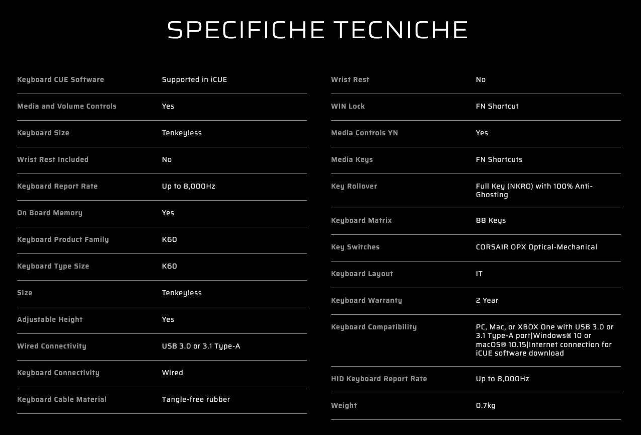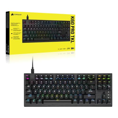 Tastiera gaming opto-meccanica RGB senza tastierino numerico. Gli esclusivi switch opto-meccanici CORSAIR OPX garantiscono un input ultrarapido grazie alla distanza di attuazione di solo 1,0 mm e alla corsa fluida e lineare, per performance di gioco di primo livello.