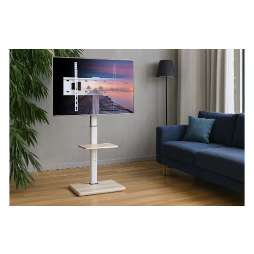 Supporto da pavimento con mensola per TV. Base e ripiano sono realizzati in MDF, finitura legno chiaro.
