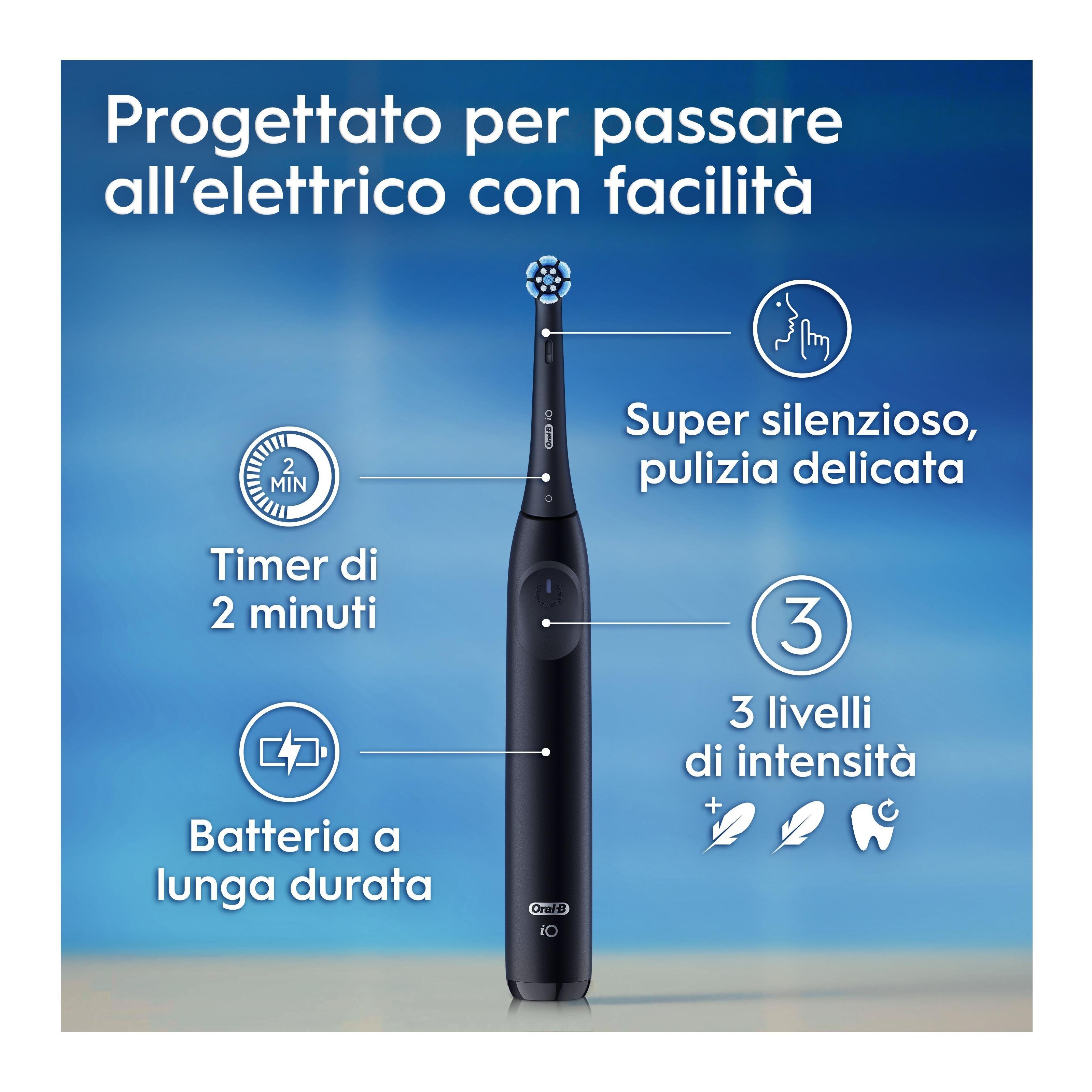 Lo spazzolino elettrico iO2 combina micro-vibrazioni delicate con una testina rotonda ispirata agli strumenti del dentista per una sensazione di pulizia professionale ogni giorno. Inclusa Custodia Da Viaggio.