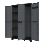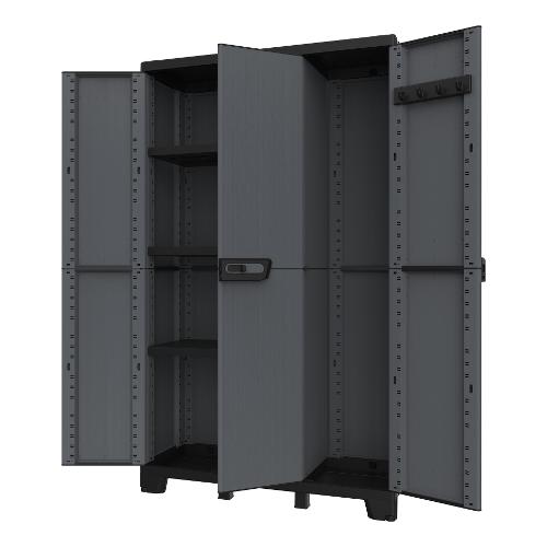 Armadio multifunzionale a tre ante composto da due vani separati con 3 ripiani interni regolabili e 1 appenditutto. Finitura effetto pietra, chiusura anti vento con predisposizione per lucchetto, apertura delle porte a 180°, piedini frontali regolabili in altezza