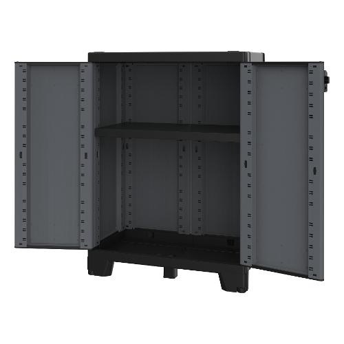 Armadietto a 2 ante con 1 ripiano regolabile. Finitura effetto pietra, chiusura anti vento con predisposizione per lucchetto, apertura delle porte a 180°, piedini frontali regolabili in altezza