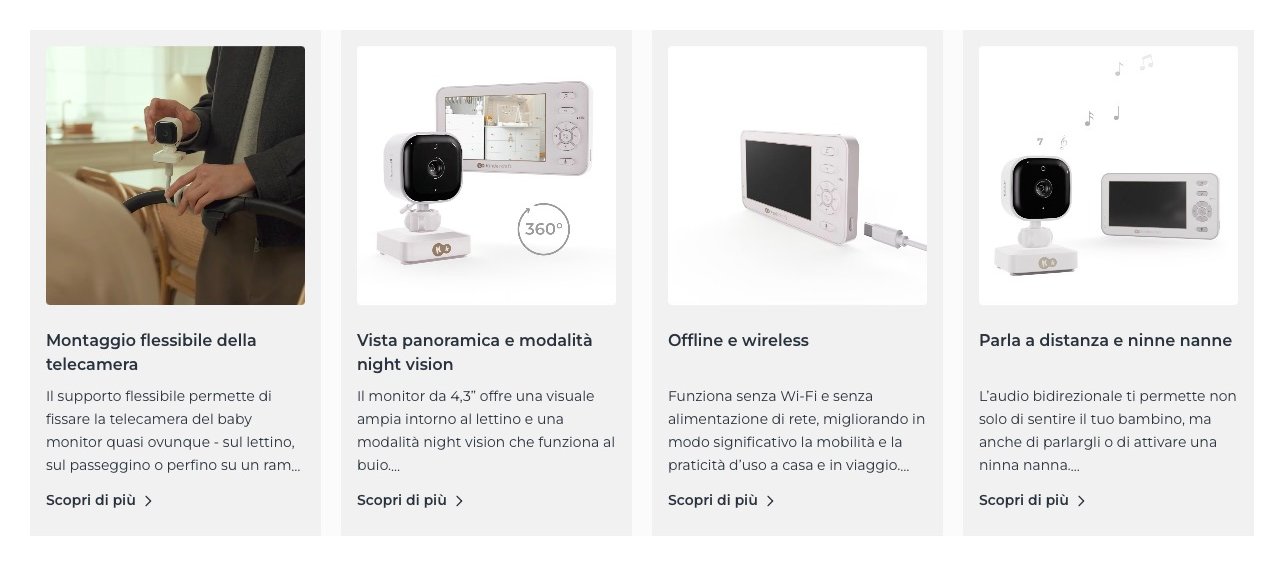 Display a colori da 4,3” con batteria da 3200 mAh e batteria 2000 mAh nella videocamera. Funzione Ninna nanna 8 melodie rilassanti per favorire il sonno; Sensore di temperatura integrato nella videocamera con avviso in caso di variazioni; Rilevamento del pianto con allarme dedicato; Visione notturna adattivazione automatica al buio; Comunicazione bidirezionale i genitori possono parlare al bambino; Allarmi di alimentazione supporto per pianificare le poppate; · Modalità VOX risparmio energetico e attivazione automatica in caso di rumore o pianto; Supporto flessibile per fissaggio facile su lettino, passeggino o altre superfici; Possibilità di collegare 2 videocamere per monitoraggio di due stanze o fratelli. Borsa da viaggio inclusa