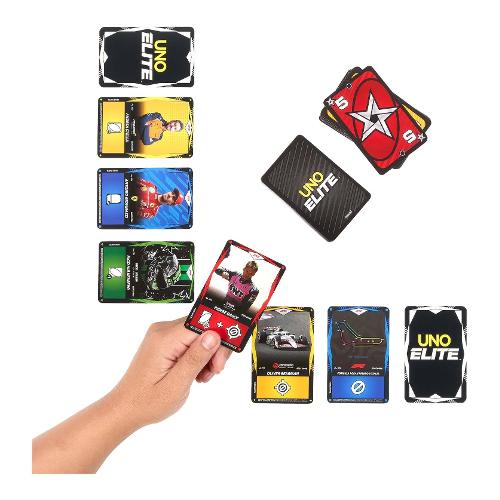 Il set include 112 carte da UNO, 4 Game Booster Pack (con 10Carte Azione Elite per confezione) e 2 Carte promozionali!. Ogni giocatore di UNO crea la propria 'rosa' dalle 8 Carte Azione Elite che riceve. Le Carte Azione Elite raffigurano piloti, auto, caschi, circuiti, presidenti delle scuderie e piloti di riserva di Formula 1. L'azione di gioco è quella del classico gioco di carte, arricchito dall'azione e dall'emozione delle corse di Formula 1! I giocatori devono semplicemente giocare una carta di colore abbinato con un'icona Elite per sbloccare il potere di una Carta Azione Elite!