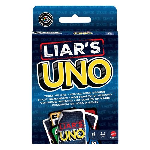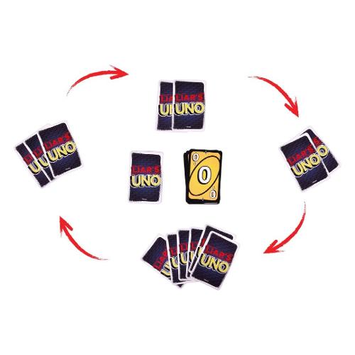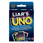 Gli appassionati di UNO adoreranno questa rivisitazione del classico gioco di carte, dove le bugie volano e i bugiardi vincono! Una "Carta del Bugiardo" viene giocata A FACCIA IN GIÙ, e poi il giocatore annuncia di cosa si tratta. Sta dicendo la verità o sta bluffando? Se viene sfidato e viene colto in flagrante a mentire, deve pescare una carta. Ma se sta dicendo la verità, l'accusatore deve pescare una carta. Quindi mantenete un'espressione seria, nascondete qualsiasi indizio e, quando rimanete con una sola carta, non dimenticate di gridare "UNO"!
