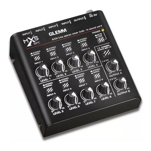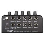 Compatto e completo, questo piccolo mixer può gestire 8 segnali mono o stereo disponibili tramite connettori 6,3mm. Ogni segnale ha a disposizione un comando di volume indipendente e un tasto per specificare se il suono del canale è mono o stereo.