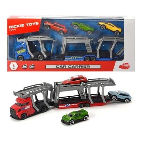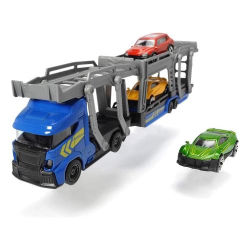 Camion bisarca di dickie toys: il trasporto delle auto non è mai stato così divertente. Con il camion bisarca di dickie toys, il divertimento è assicurato: il camion per il trasporto delle auto con funzionamento a ruota libera offre ampio spazio per tre macchinine die cast, già incluse nel set. Le ulteriori parti mobili permettono di caricare e scaricare il mezzo facilmente, proprio come accade su una bisarca vera.