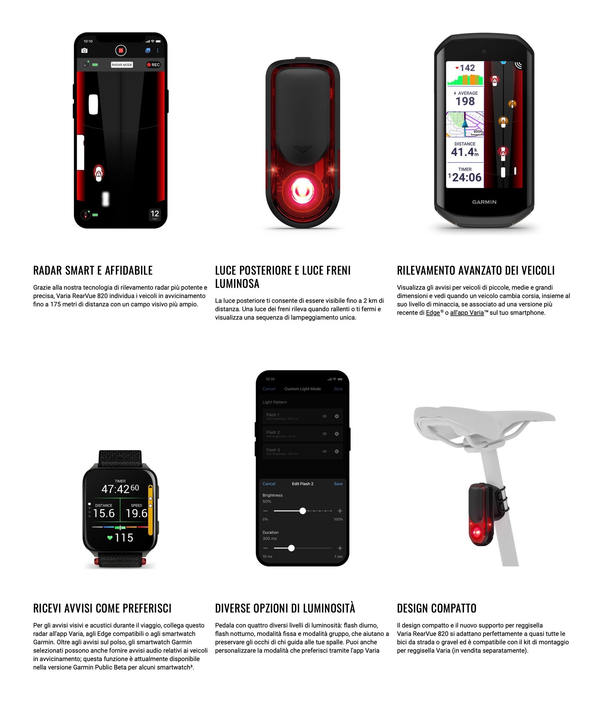 Per gli avvisi visivi e acustici durante il viaggio, collega questo radar all'app Varia, agli Edge compatibili o agli smartwatch Garmin. Oltre agli avvisi sul polso, gli smartwatch Garmin selezionati possono anche fornire avvisi audio relativi ai veicoli in avvicinamento; questa funzione è attualmente disponibile nella versione Garmin Public Beta per alcuni smartwatch.
