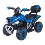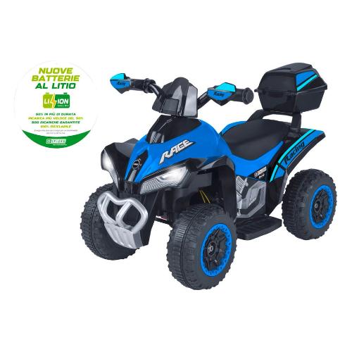 Sali a bordo di questo quad race elettrico per bambini dal design sportivo e aerodinamico per i primissimi viaggi alla scoperta del mondo. Seduta comoda, sicura e dinamica per una vera esperienza di guida in totale sicurezza per tutti i bambini dai 3 anni in su che desiderano esplorare il mondo in autonomia. Funzioni realistiche: accensione con effetti sonori, clacson funzionante, fari led anteriori, musica e suoni integrati per un effetto realistico.design realistico: ricco di dettagli, dalle linee sportive e accessori realistici. Con pratico bauletto posteriore portaoggetti, paramani e 4 robuste ruote adatte ad ogni tipo di terreno. Movimento anche in retromarcia. Il pedale dell'accelerazione raggiunge una velocità massima di 3 km/h. Portata massima: 20 kg, autonomia batteria: 1-2 ore