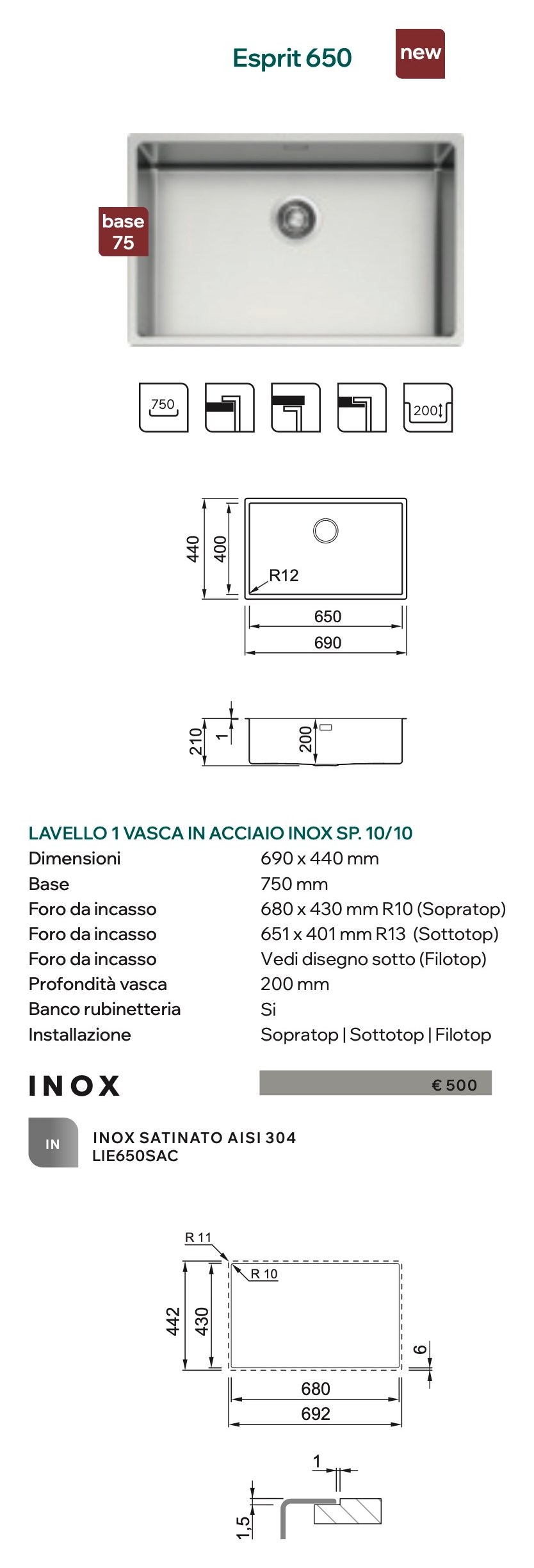 Lavello 1 vasca (69x44x20cm) ESPRIT 650 Inox Satinato LIE650SAC