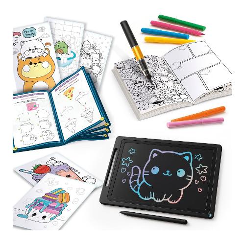 Al centro dell'esperienza si trova una pratica tavoletta LCD da 12 pollici, uno spazio magico e infinitamente riutilizzabile dove esercitarsi senza timore di sbagliare: un semplice gesto cancella ogni segno, invitando a riprovare, perfezionare e sperimentare con serenità. Accanto a questa superficie digitale, il fude pen, ispirato ai pennelli tradizionali orientali, insegna la delicatezza del tratto e la variazione della pressione per ottenere linee sottili o decise, mentre i sei pennarelli colorati e gli allegri sticker permettono di dare vita ai disegni con tonalità vivaci e dettagli giocosi. Sedici schede guida propongono modelli progressivi da seguire passo dopo passo, accompagnati da una guida illustrata che svela i segreti per trasformare semplici cerchi e ovali in simpatici animaletti, dolcetti parlanti e oggetti animati dallo sguardo sognante. Una volta acquisita sicurezza sulla tavoletta, i piccoli artisti potranno riversare le proprie creazioni nel quaderno personale, creando una raccolta preziosa dei loro progressi.