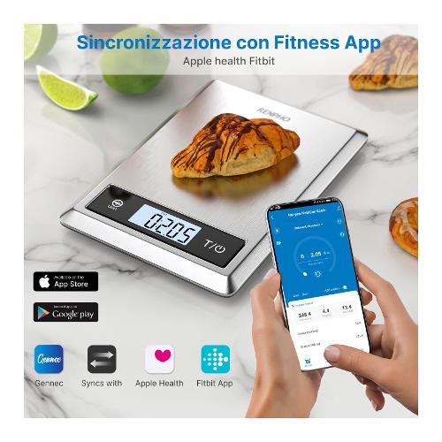 Trasforma il modo in cui prepari i tuoi pasti con la bilancia nutrizionale smart RENPHO Calibra 1. Progettata per essere la compagna ideale in cucina, questa bilancia non si limita a pesare gli ingredienti, ma ti offre un'analisi dettagliata dei valori nutrizionali di ciò che mangi, supportandoti nel mantenimento di uno stile di vita equilibrato e consapevole. Analisi Nutrizionale Avanzata: Sincronizza la bilancia con l'app tramite Bluetooth per accedere a un vasto database di alimenti. L'app calcola istantaneamente le calorie e i principali macronutrienti del tuo pasto (Proteine, Grassi Totali, Carboidrati, Zuccheri e Fibre).