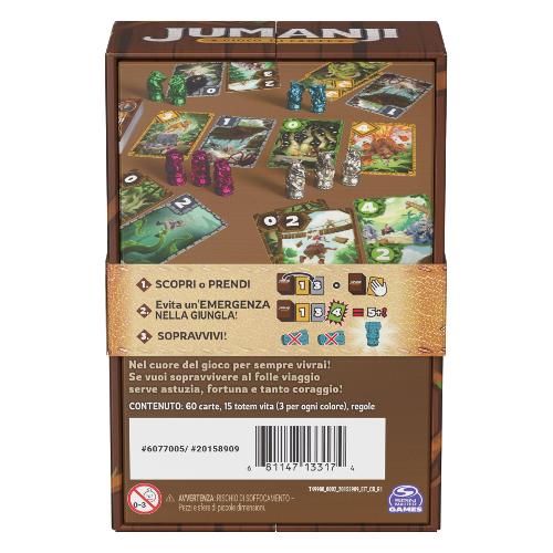 Sfida Jumanji con i tuoi totem animali per vincere in un classico gioco di carte da abbinare ai colori a tema Jumanji. Quando è il tuo turno, scegli di pescare dal mazzo o gira le carte e prendine una. Se non ci sono carte da girare, girarne una e posizionala accanto al mazzo per il giocatore successivo. Se la somma totale di tutte le carte è pari o superiore a cinque, devi prendere tutte le carte girate e metterle rivolte verso l'alto davanti a te. Se hai più di 3 carte dello stesso colore, devi scartare uno dei tuoi totem animali. Il giocatore che perde tutti i totem perde il gioco. Per 2-5 giocatori, dai 7 anni in su. Spin Master porta a casa tua il divertimento dell'intrattenimento per bambini con una gamma di giochi e giocattoli, tra cui giocattoli per neonati, giocattoli per bambine, giochi da tavolo, peluche, giocattoli tattili, auto radiocomandate, action figure, bambole e tanto altro. Scatena la creatività con giochi artistici e giocattoli per le costruzioni, oppure scegli giochi da fare seduti al tavolo come puzzle per adulti o giochi di carte. Sfoglia il nostro ricco catalogo per trovare facilmente regali per adulti, liste nascita e bimbi piccoli.