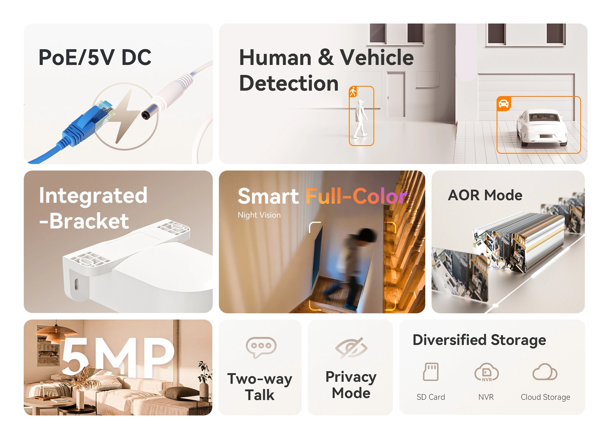 Supporta sia l'alimentazione PoE che quella a 5 V CC, offrendo opzioni di installazione flessibili. La telecamera è dotata di una staffa di montaggio integrata, che velocizza l'installazione.