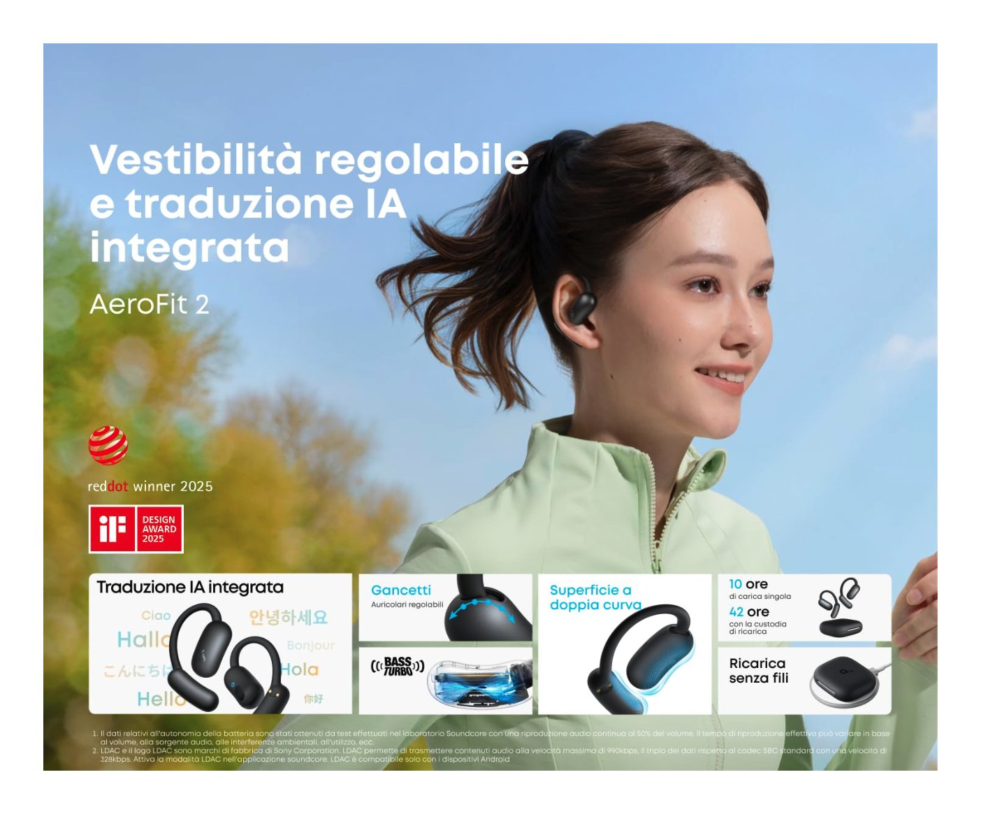 Dalle chat al traffico, rimani in sintonia con l'ambiente circostante con le cuffie aperte AeroFit 2. Ascolta le tue colonne sonore preferite e tieni d'occhio tutto ciò che accade intorno a te.