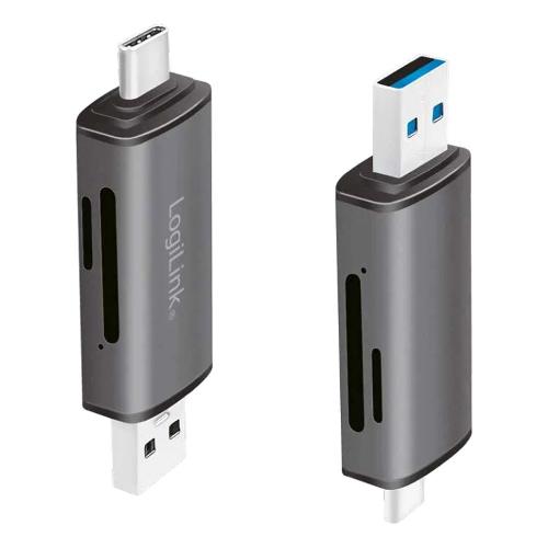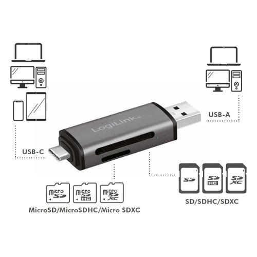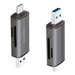 Lettore di schede USB 3.2 Gen 1 utilizzato per leggere i dati dalle schede di memoria e trasferirli contemporaneamente attraverso le porte USB (USB-C e USB A OTG) ai computer, tablet o smartphone abilitati