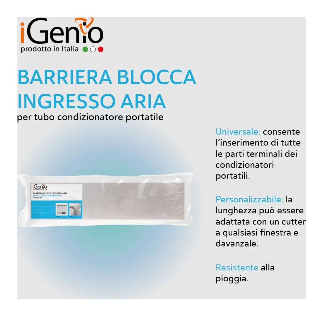 La Barriera Universale iGenio è una soluzione tecnica progettata per il posizionamento ottimale della parte terminale del tubo di scarico di condizionatori portatili, consentendo la chiusura completa della tapparella. Dotata di elementi pre-tagliati, garantisce un’ampia compatibilità di terminali di scarico per condizionatori portatili di diverse forme e misure.