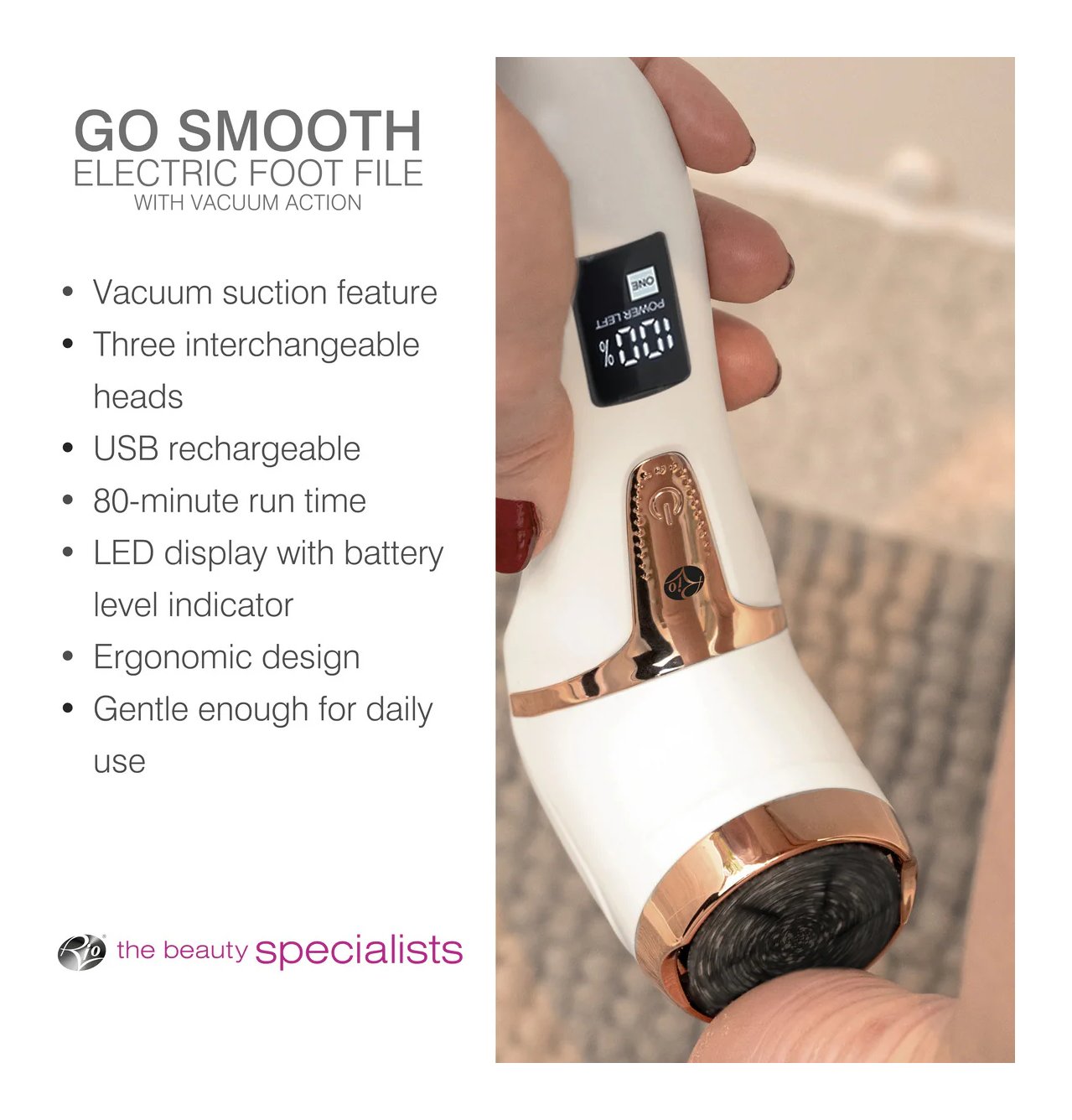 Affronta i talloni screpolati più ostinati e la pelle dura più resistente con questa innovativa lima elettrica per piedi, dotata di un esclusivo sistema di aspirazione che cattura i trucioli di pelle durante l'utilizzo, garantendo un'esperienza pulita e senza problemi. Grazie alla possibilità di scegliere tra testine a grana normale, grossa o fine, la lima per piedi Go Smooth si adatta alle esigenze della tua pelle, offrendo un approccio personalizzato alla cura dei piedi.